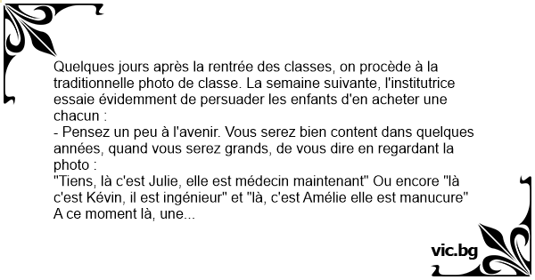 Quelques jours après la rentrée des classes, on procède à la traditionnelle photo de classe. La semaine suivante, l'institutrice essaie évidemment de persuader les enfants d'en acheter une chacun :