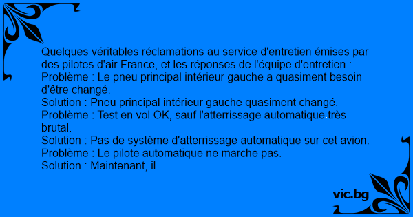 Quelques véritables réclamations au service d'entretien émises par des pilotes d'air France, et les réponses de l'équipe d'entretien :