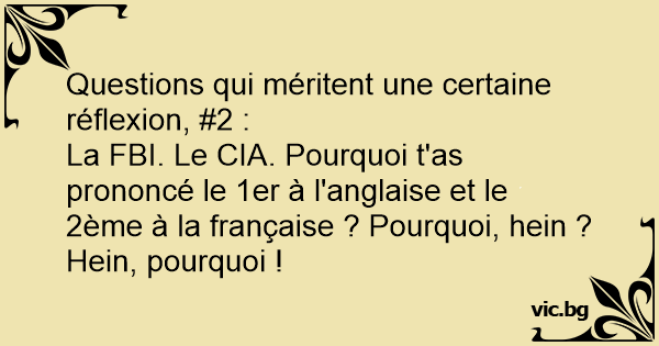 La FBI. Le CIA. Pourquoi t'as prononcé le 1er à l'anglaise et le 2ème à la française ? Pourquoi, hein ? Hein, pourquoi !