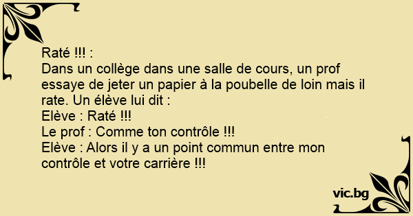 Dans un collège dans une salle de cours, un prof essaye de jeter un papier à la poubelle de lоin mais il rate. Un élève lui dit :