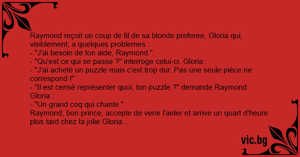 Une blonde appelle son mari, en panique: "- Chéri? Vite, rentre à la maison !! - Que se passe t il? - J'ai voulu faire un puzzle toute seule, alors jen ai acheté un, c'était écrit "idéal pour le développement des enfants" dessus. Il y a un joli coq dessiné dessus. Mais même pour les enfants, je...