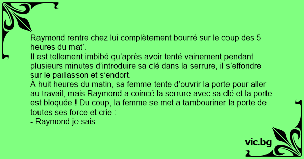 À huit heures du matin, sa femme tente d’ouvrir la porte pour aller au travail, mais Raymond a coincé la serrure avec sa clé et la porte est bloquée ! Du coup, la femme se met a tambouriner la porte de toutes ses force et crie :