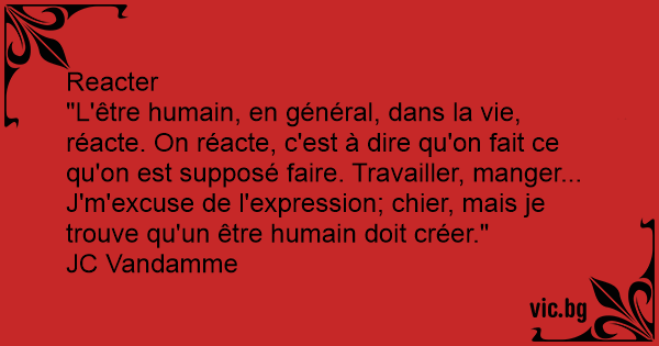 "L'être humain, en général, dans la vie, réacte. On réacte, c'est à dire qu'on fait ce qu'on est supposé faire. Travailler, manger... J'm'excuse de l'expression; chier, mais je trouve qu'un être humain doit créer."