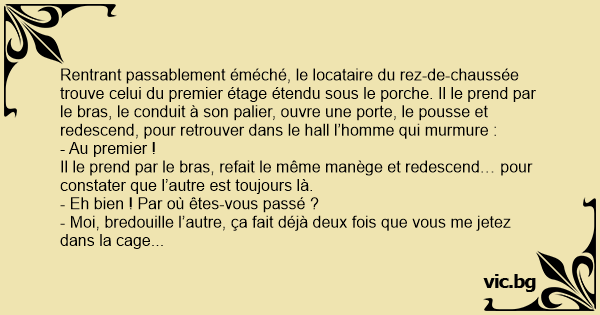 Rentrant passablement éméché, le locataire du rez-de-chaussée trouve celui du premier étage étendu sous le porche. Il le prend par le bras, le conduit à son palier, ouvre une porte, le pousse et redescend, pour retrouver dans le hall l’homme qui murmure :