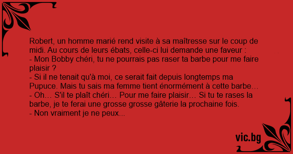- Oh… S'il te plaît chéri… Pour me faire plaisir… Si tu te rases la barbe, je te ferai une grosse grosse gâterie la prochaine fois.