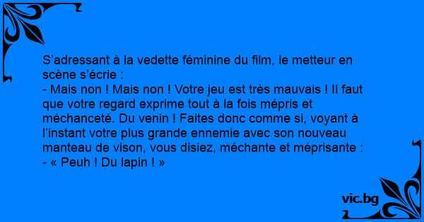 - Mais non ! Mais non ! Votre jeu est très mauvais ! Il faut que votre regard exprime tout à la fois mépris et méchanceté. Du venin ! Faites donc comme si, voyant à l’instant votre plus grande ennemie avec son nouveau manteau de vison, vous disiez, méchante et méprisante :