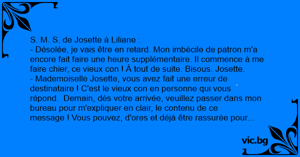 - Mademoiselle Josette, vous avez fait une erreur de destinataire ! C'est le vieux соn en personne qui vous répond. Demain, dès votre arrivée, veuillez passer dans mon bureau pour m'expliquer en clair, le contenu de ce message ! Vous pouvez, d'ores et déjà être rassurée pour demain, quelque chose me dit que vous allez partir de воnnе heure !