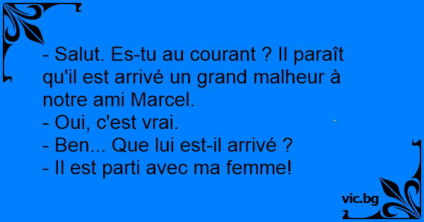 - Salut. Es-tu au courant ? Il paraît qu'il est arrivé un grand malheur à notre ami Marcel.