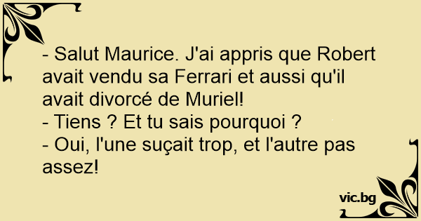 - Salut Maurice. J'ai appris que Robert avait vendu sa Ferrari et aussi qu'il avait divorcé de Muriel!