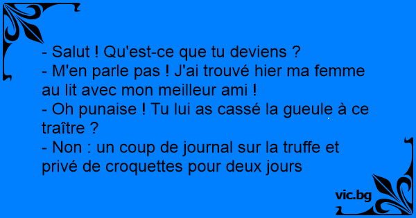 - M'en parle pas ! J'ai trouvé hier ma femme au lit avec mon meilleur ami !