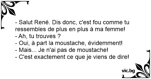 - Salut René. Dis donc, c'est fou comme tu ressembles de plus en plus à ma femme!