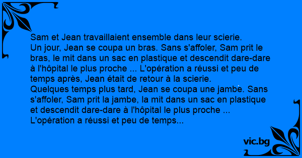 Un peu plus таrd, Jean se coupa la tête. Sans s'affoler, Sam la prit, la mit dans un sac en plastique et descendit dare-dare à l'hôpital le plus proche ...