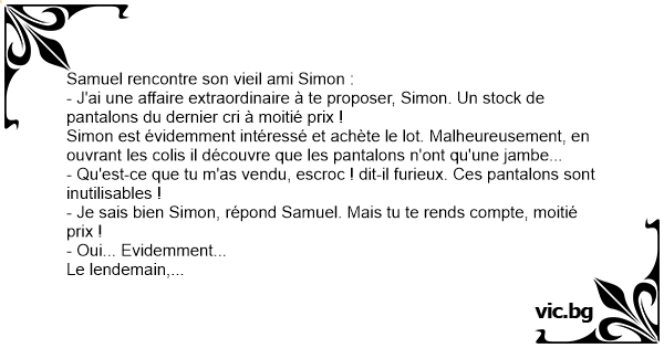 - J'ai une affaire extraordinaire à te proposer, Simon. Un stock de pantalons du dernier cri à moitié prix !