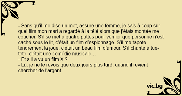 - Sans qu’il me dise un mot, assure une femme, je sais à coup sûr quel film mon mari a regardé à la télé alors que j’étais montée me coucher. S’il se met à quatre pattes pour vérifier que personne n’est caché sous le lit, c’était un film d’espionnage. S’il me tapote tendrement la joue, c’était un beau film d’amour. S’il chante à tue-tête, c’était une comédie musicale…