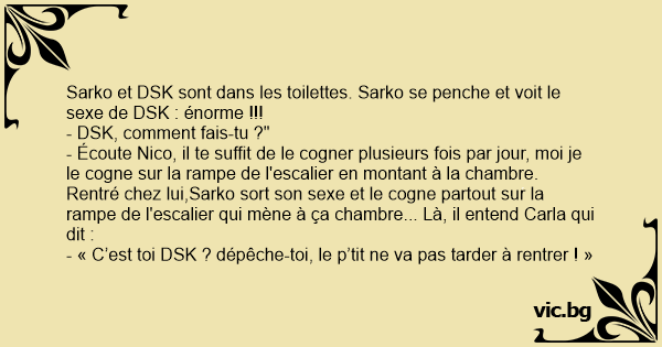 Sarko et DSK sont dans les toilettes. Sarko se penche et voit le sexe de DSK : énorme !!!