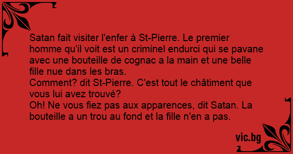 Sатаn fait visiter l'enfer à St-Pierre. Le premier homme qu'il voit est un criminel endurci qui se pavane avec une bouteille de cognac a la main et une belle fille nue dans les bras.