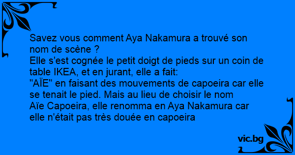 "AÏE" en faisant des mouvements de capoeira car elle se tenait le pied. Mais au lieu de choisir le nom Aïe Capoeira, elle renomma en Aya Nakamura car elle n'était pas très douée en capoeira