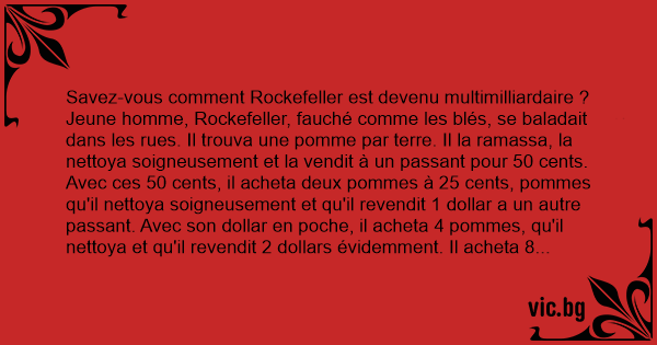 Jeune homme, Rockefeller, fauché comme les blés, se baladait dans les rues. Il trouva une pomme par terre. Il la ramassa, la nettoya soigneusement et la vendit à un passant pour 50 cents. Avec ces 50 cents, il acheta deux pommes à 25 cents, pommes qu'il nettoya soigneusement et qu'il revendit 1 dollar a un autre passant. Avec son dollar en poche, il acheta 4 pommes, qu'il nettoya et qu'il revendit 2 dollars évidemment. Il acheta 8 pommes, qu'il nettoya.
