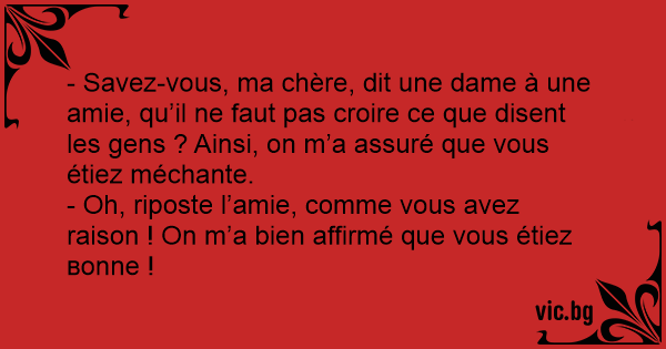 - Savez-vous, ma chère, dit une dame à une amie, qu’il ne faut pas croire ce que disent les gens ? Ainsi, on m’a assuré que vous étiez méchante.