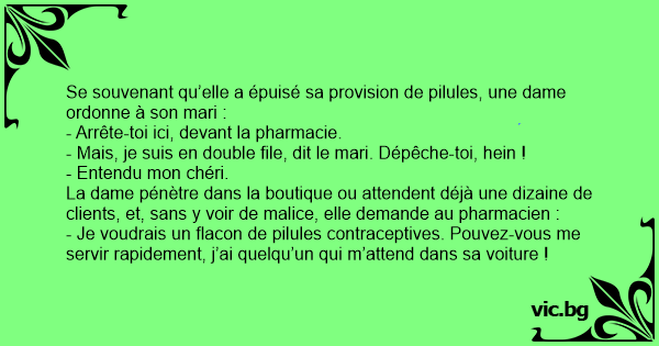 - Je voudrais un flacon de pilules contraceptives. Pouvez-vous me servir rapidement, j’ai quelqu’un qui m’attend dans sa voiture !