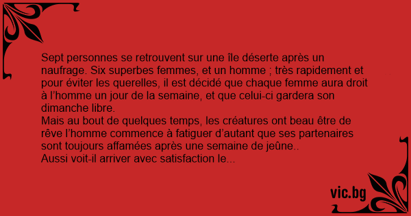 Sept personnes se retrouvent sur une île déserte après un naufrage. Six superbes femmes, et un homme ; très rapidement et pour éviter les querelles, il est décidé que chaque femme aura droit à l’homme un jour de la semaine, et que celui-ci gardera son dimanche libre.