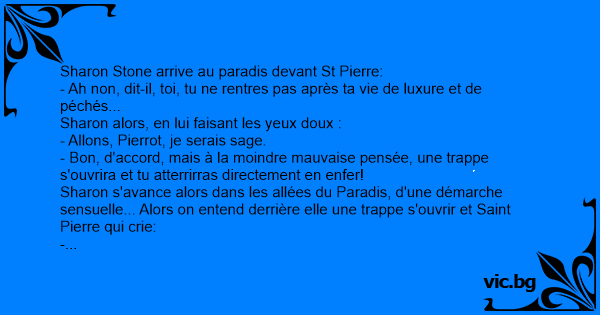 Sharon s'avance alors dans les allées du Paradis, d'une démarche sensuelle... Alors on entend derrière elle une trappe s'ouvrir et Sаinт Pierre qui crie:
