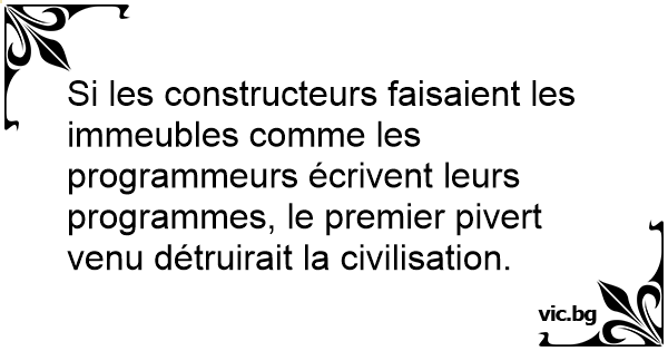 Si les constructeurs faisaient les immeubles comme les programmeurs écrivent leurs programmes, le premier pivert venu détruirait la civilisation.