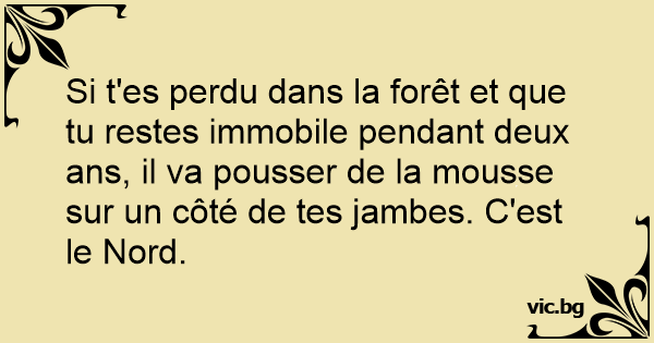 Si t'es perdu dans la forêt et que tu restes immobile pendant deux ans, il va pousser de la mousse sur un côté de tes jambes. C'est le Nord.
