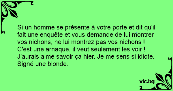 Si un homme se présente à votre porte et dit qu'il fait une enquête et vous demande de lui montrer vos nichons, ne lui montrez pas vos nichons ! C'est une arnaque, il veut seulement les voir !