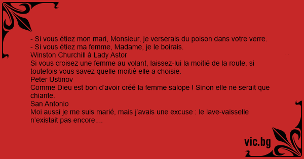 - Si vous étiez mon mari, Monsieur, je verserais du poison dans votre verre.