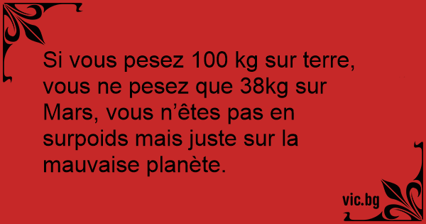 Si vous pesez 100 kg sur terre, vous ne pesez que 38kg sur Mars, vous n’êtes pas en surpoids mais juste sur la mauvaise planète.