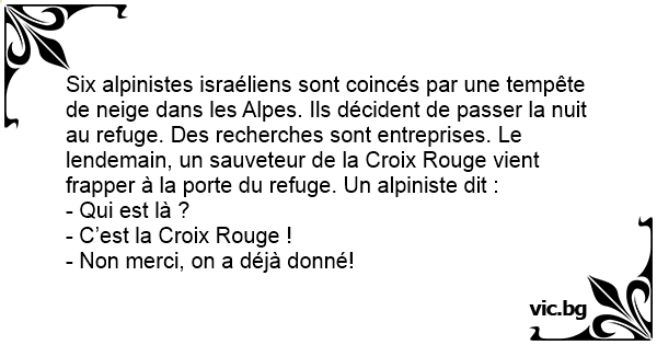 Six alpinistes israéliens sont coincés par une tempête de neige dans les Alpes. Ils décident de passer la nuit au refuge. Des recherches sont entreprises. Le lendemain, un sauveteur de la Croix Rouge vient frapper à la porte du refuge. Un alpiniste dit :