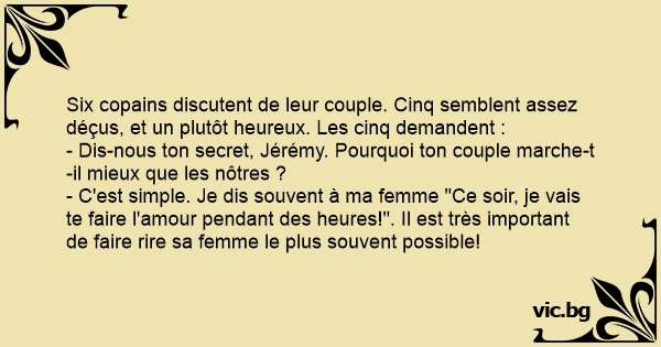 - C'est simple. Je dis souvent à ma femme "Ce soir, je vais te faire l'amour pendant des heures!". Il est très important de faire rire sa femme le plus souvent possible!