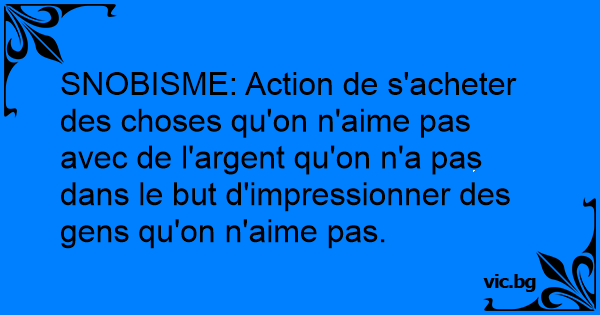 SNOBISME: Action de s'acheter des choses qu'on n'aime pas avec de l'argent qu'on n'a pas dans le but d'impressionner des gens qu'on n'aime pas.