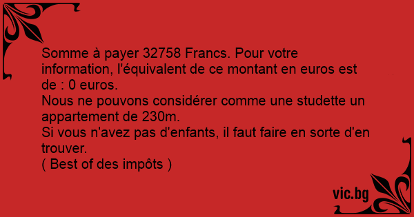 Somme à payer 32758 Francs. Pour votre information, l'équivalent de ce montant en euros est de : 0 euros.