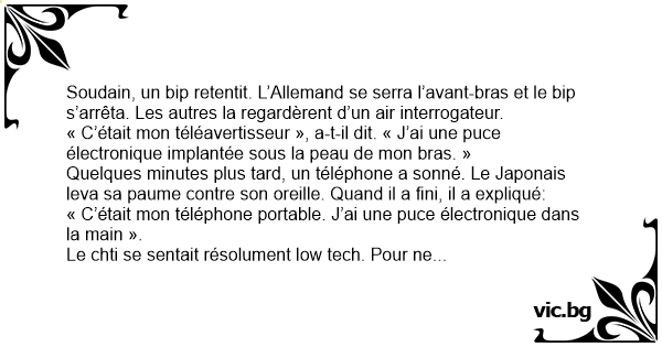 Tres presidentes (Obama, Sarkozy y Calderón) están desnudos en la sauna de la casa blanca, discutiendo cuál será la estrategia a seguir para derrotar al terrorismo. Tre uomini si stanno rilassando in una sauna quando all'improvviso si ode un trillo. Uno di essi porge una mano all'orecchio ed inizia a parlare; quando finisce si sente osservatissimo e spiega: Three men are sitting naked in the sauna. Suddenly there is a beeping sound. The first man presses his forearm and the beeping stops. The others look at him questioningly. "That's my pager," he says. "I have a microchip under the skin of my arm." A few minutes later a phone rings. The second... Tres hombres están desnudos en la sauna. De repente algo empieza a pitar. El primer hombre, un ingeniero de la Politécnica de Cataluña, aprieta su antebrazo y el pitido para. Los otros lo miran inquisitivamente. - "Es mi busca", dice. "Tengo un microchip bajo la piel de mi brazo". Unos minutos... Três homens estavam sentados nus na sauna. Um Americano, um Japonês e um Brasileiro. De repente, um bip soa. O Americano pressiona seu antebraço e o barulhinho pára. Os outros olham para ele, curiosos. — É meu pager, meu aparelhinho de bip, ele fala. Tenho um microchip sob a pele do meu braço.... Bill Gates, Andrew Grove von Intel und Jerry Sanders von AMD sitzen in einer Konferenz. Plötzlich entschuldigt sich Bill Gates und fängt an, mit seiner Armbanduhr zu reden. Grove und Sanders... Three guys are sitting in a sauna: a Mexican, an Asian, and a white guy. The Mexican and white guy are showing off their new tech gadgets. The white guy says, "Hey, look what I got: the new Google... Eram três homens um Brasileiro um Chinês e um Argentino. O Chinês todo esperto enventou um celular na mão e disse: -Olha Brasileiro olha Argentino. E os dois: -Nooooooooooooooossa. e o... Japanilainen, saksalainen ja suomalainen olivat lounaalla ravintolassa. Japanilaisen kello alkoi soida, ja hän vastasi kellopuhelimeensa. Suomalainen tuumasi, että onpas tekniikka kehittynyt... Suomalainen, sveitsiläinen ja japanilainen insinööri olivat kokoontuneet neuvotteluun. Yllättäen jostain kuului pirinää, sitten sveitsiläinen insinööri alkoi puhua rannekelloonsa. Hetken päästä...