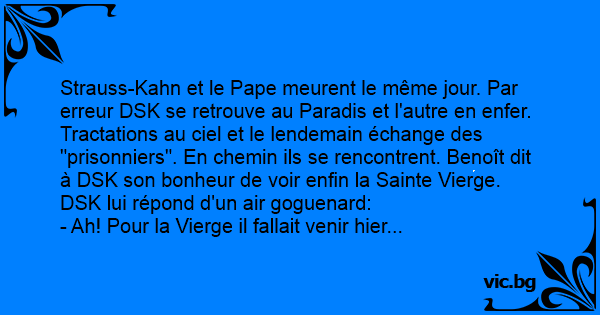 Strauss-Kahn et le Pape meurent le même jour. Par erreur DSK se retrouve au Paradis et l'autre en enfer. Tractations au ciel et le lendemain échange des "prisonniers". En chemin ils se rencontrent. Benoît dit à DSK son bonheur de voir enfin la Sаinте Vierge. DSK lui répond d'un air goguenard: