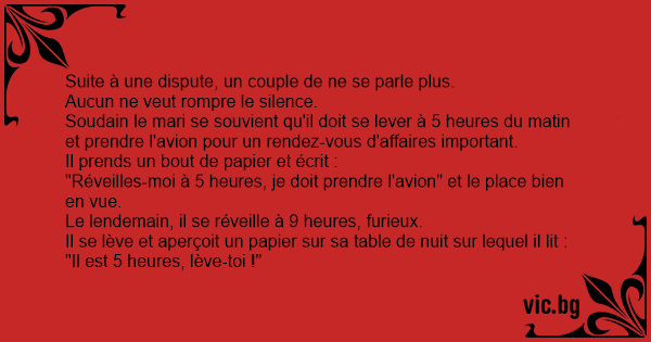 Soudain le mari se souvient qu'il doit se lever à 5 heures du matin et prendre l'avion pour un rendez-vous d'affaires important.