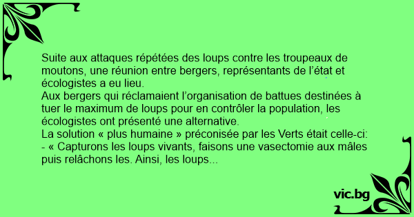 - « Capturons les loups vivants, faisons une vasectomie aux mâles puis relâchons les. Ainsi, les loups opérés garderont leur instinct de mâles, il feront comme d’habitude leurs saillies sur les femelles, mais par contre, les femelles ne seront plus fécondées, c’est de cette manière que la population sera le mieux contrôlée. »
