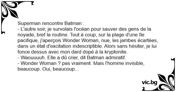 - L'autre soir, je survolais l'océan pour sauver des gens de la noyade, bref la routine. Tout à coup, sur la plage d'une île pacifique, j'aperçois Wonder Woman, nue, les jambes écartées, dans un état d'excitation indescriptible. Alors sans hésiter, je lui fonce dessus avec mon dard dopé à la kryptonite.