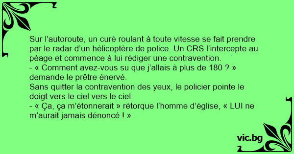 Sur l’autoroute, un curé roulant à toute vitesse se fait prendre par le radar d’un hélicoptère de police. Un CRS l’intercepte au péage et commence à lui rédiger une contravention.