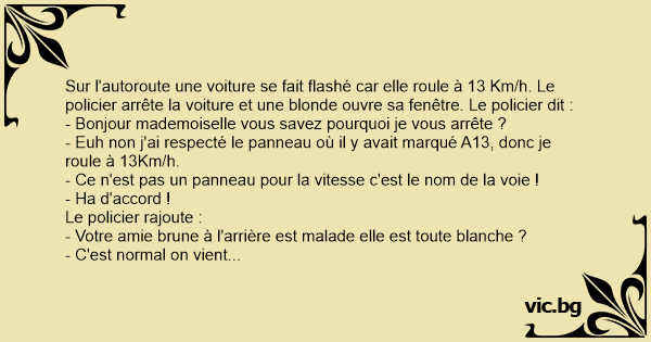 Sur l'autoroute une voiture se fait flashé car elle roule à 13 Km/h. Le policier arrête la voiture et une blonde ouvre sa fenêtre. Le policier dit :