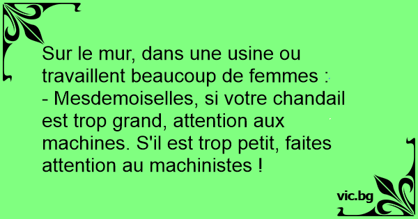 - Mesdemoiselles, si votre chandail est trop grand, attention aux machines. S'il est trop petit, faites attention au machinistes !