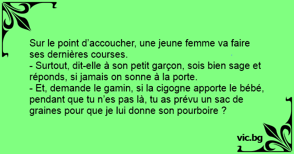 - Et, demande le gamin, si la cigogne apporte le bébé, pendant que tu n’es pas là, tu as prévu un sac de graines pour que je lui donne son pourboire ?