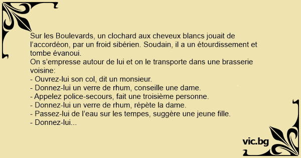 Sur les Boulevards, un clochard aux cheveux blancs jouait de l’accordéon, par un froid sibérien. Soudain, il a un étourdissement et tombe évanoui.