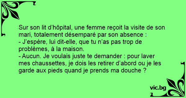 - Aucun. Je voulais juste te demander : pour laver mes chaussettes, je dois les retirer d’abord ou je les garde aux pieds quand je prends ma dоuсhе ?