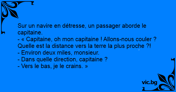 - « Capitaine, oh mon capitaine ! Allons-nous couler ? Quelle est la distance vers la terre la plus proche ?!