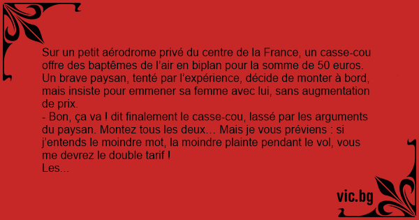 Sur un petit aérodrome privé du centre de la France, un casse-cou offre des baptêmes de l’air en biplan pour la somme de 50 euros. Un brave paysan, tenté par l’expérience, décide de monter à bord, mais insiste pour emmener sa femme avec lui, sans augmentation de prix.