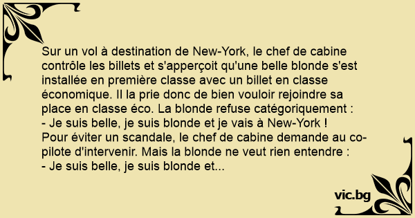 Flygvärdinnan på ett flygplan som skulle till New York gick fram till en blond kvinna som satt i första klass. Flygvärdinnan bad blondinen att flytta till ekonomiklassens avdelning, eftersom hon inte hade någon biljett för första klass. Blondinen...