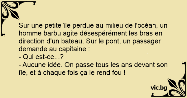 Sur une petite île perdue au milieu de l'océan, un homme barbu agite désespérément les bras en direction d'un bateau. Sur le pont, un passager demande au capitaine :
